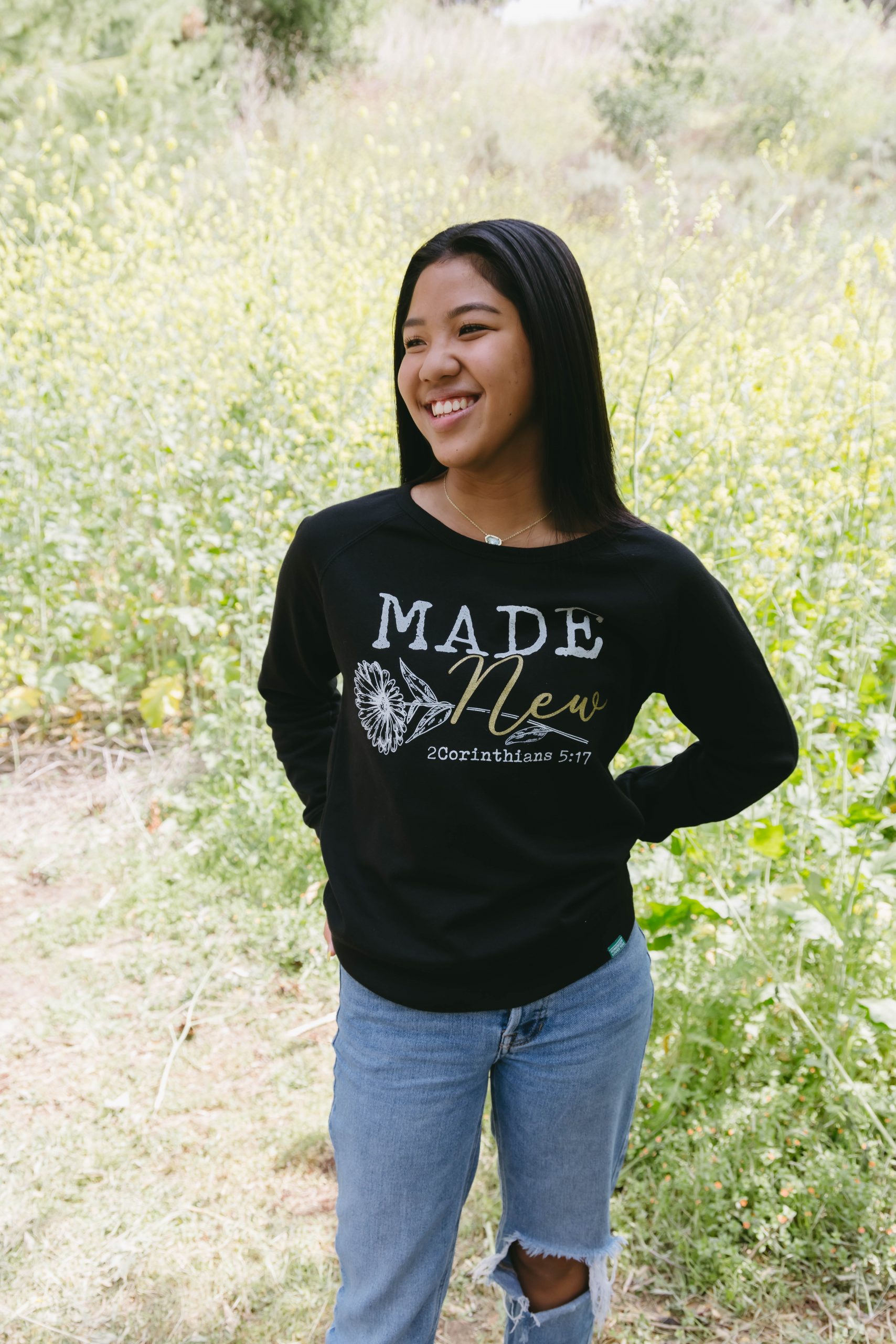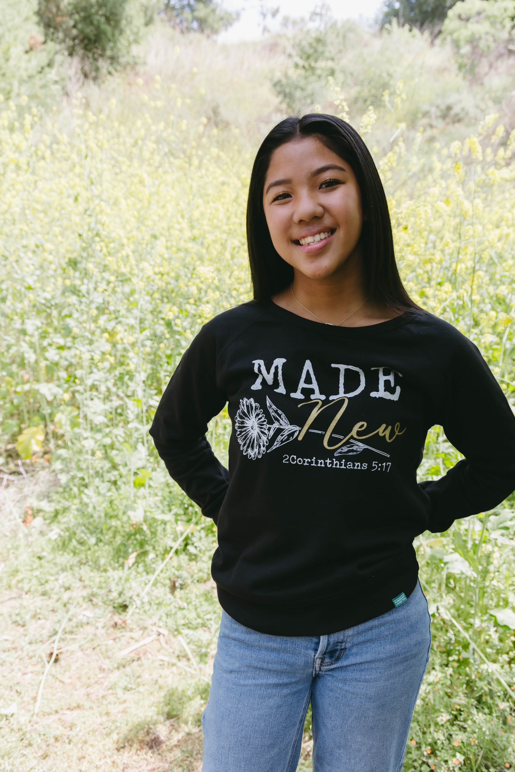 The Made New Sweatshirt with a relaxed fitting neck features a front screen print. Product with a purpose! All proceeds go to supporting Somebody Loves You Radio with Raul Ries and the teaching of God’s Word.